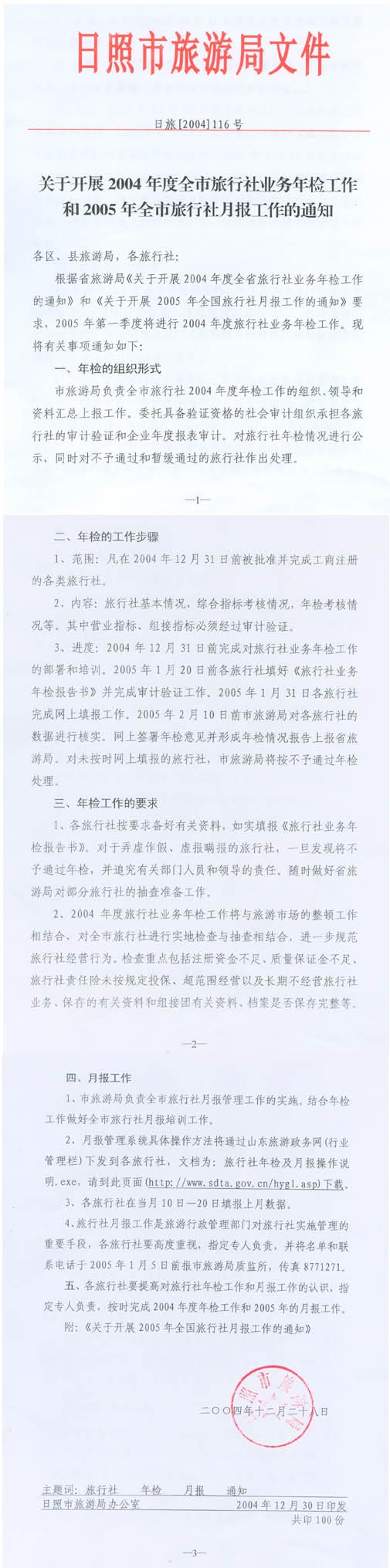 关于开展2004年度全市旅行社业务年检工作和2005年全市旅行社月报工作的通知(2004年12月31日)