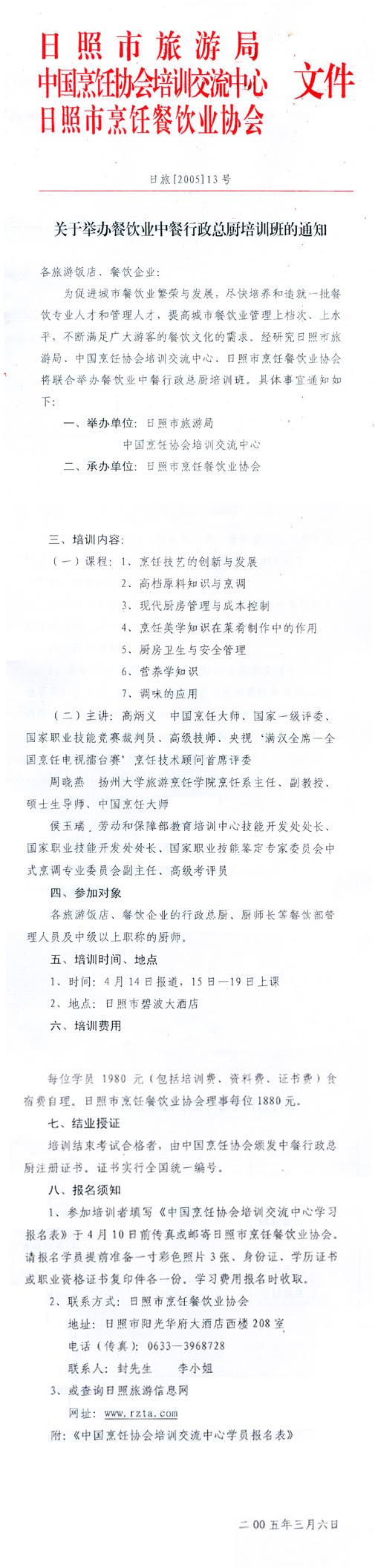 关于举办餐饮业中餐行政总厨培训班的通知(2005年03月11日)