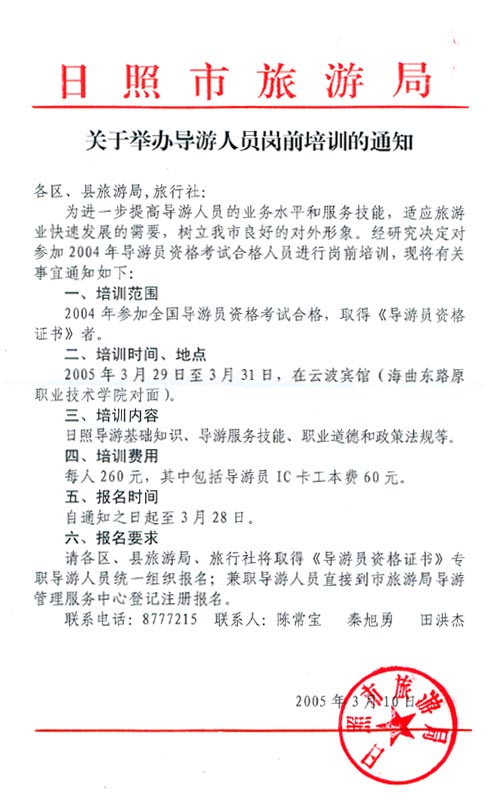 关于举办导游人员岗前培训的通知(2005年03月12日)