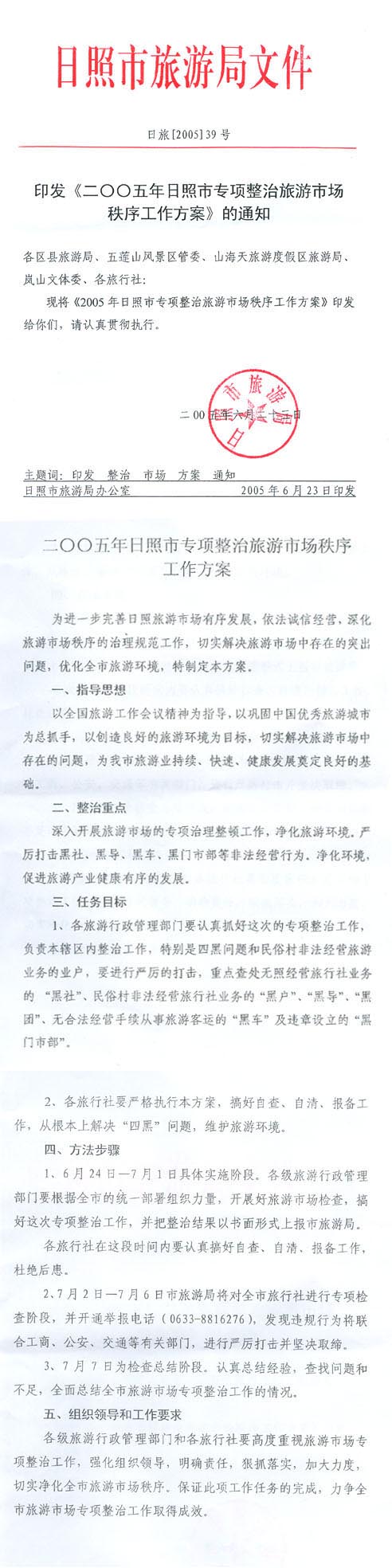 印发《二○○五年日照市专项整治旅游市场秩序工作方案》的通知(2005年06月29日)