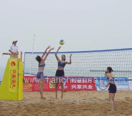 “安泰房产杯”2005年山东省沙滩排球锦标赛首日比赛 比赛选手双手拦网(2005年07月02日)