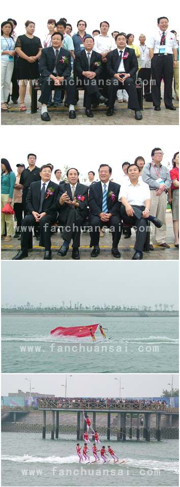 9月2日上午,2005国际游艇(日照)展览交易会启动仪式圆满结束后,与会的各位领导、嘉宾,来自远方的朋友和港城的市民一起,兴致勃勃的观看了中国艺术滑水队的精彩表演。世帆赛基地的港池内,细雨轻飘,波浪起伏。中国艺术滑水队的精彩表演,博得了观众如潮的欢呼。他们表演的“红旗飘飘”、“多人罗汉”、“水上芭蕾”、“尾波滑水”等节目,如盛开的水上奇葩。