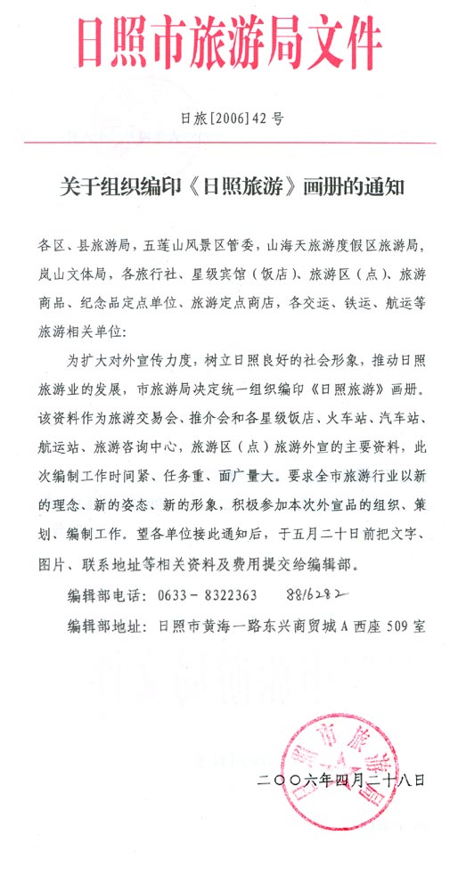 公告 关于组织编印《日照旅游》画册的通知(2006年05月15日)