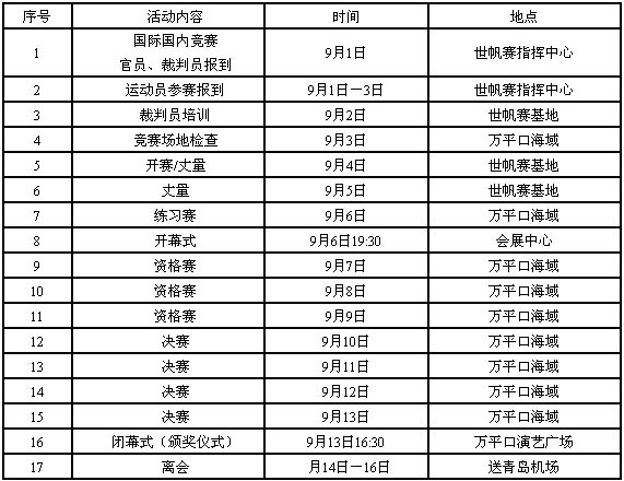 备注:1.资格赛、决赛每天第一轮比赛启航信号时间预定10:00,具体由总裁判长根据竞赛海域风力情况确定。 2.竞赛期间临时活动安排须经大会组委会或总裁判长决定并在官方公告栏及时发布。