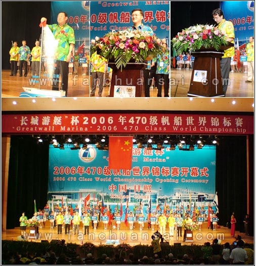 9月6日晚,“长城游艇杯”2006年470级帆船世界锦标赛开幕式在日照会展中心隆重举行。山东省副省长张昭福为比赛启航发令。日照市市长杨军、国家体育总局水上运动管理中心主任韦迪、国际470级帆船联合会主席爱伯特·普瑞斯里分别致辞。副市长解世增主持开幕式。 国际470级帆船联合会主席爱伯特·普瑞斯里,国际470级帆船联合会秘书长阿兰·考卡夫,国家体育总局水上运动管理中心主任韦迪,国家体育总局水上运动管理中心副主任李全海,山东省副省长张昭福,省市有关领导、国际帆联官员、各国家和地区代表队、中外记者、赞助商代表出席开幕仪式。 在欢快的乐曲中,参加本次国际帆船赛的33个国家和地区的运动员依次入场。升中华人民共和国国旗、奏中华人民共和国国歌之后,杨军、韦迪、爱波特·普瑞斯里先后致辞。 杨军在欢迎辞中说,我谨代表中共日照市委、日照市人民政府和280万热情好客的日照人民,向大会的开幕表示衷心的祝贺,向出席开幕式的各位来宾、各位朋友和参加大赛的全体运动员、教练员、技术官员、中外记者和赞助商代表示热烈的欢迎。他说,和平与发展是当今世界的主题,现代帆船运动已成为各国人民开展体育、文化交流的重要载体。作为中国第九大港口城市、海滨生态旅游城市,日照正在为发展世界水上运动特别是帆船运动,展示各国运动员迎风斗浪、挑战自我的精神,增进各国人民的友谊作出积极的努力。2002年11月9日,在塞浦路斯帆船俱乐部召开的国际470帆船联合会年会上,日照市获得2006年470级帆船世界锦标赛承办权。四年前世界给了日照一个机会;四年后的今天,日照正在努力还给世界一个惊喜。我们相信在海内外朋友的鼎力支持下,一定能够奉献一场精彩、难忘的470级帆船世锦赛。日照的城市魅力与“水上运动之都”的品牌一定会给大家留下美好的记忆。470级帆船世界锦标赛让我们相聚日照,今天的日照已经成为帆船爱好者共同的舞台,让我们扬起风帆,扬起梦想,感受大海、感受阳光、感受“水上运动之都”——中国日照的魅力和风采。 韦迪在致辞中说,日照市风景秀丽,气候宜人,是开展水上竞技运动、休闲旅游和科技教育的理想之地。日照世帆赛基地是国家水上运动训练基地,也是2008年奥运会帆船帆板赛前训练备选场地。目前,具有国际水准的水上运动公园正在建设之中,2007年首届中国水上运动会将在此举办。本次比赛既是在我国首次举办奥运帆船项目的世界锦标赛,也是2008年北京奥运会帆船比赛的重要练兵。我们相信,有国际470帆船联合会和各参赛嘉宾的支持,通过大家的共同努力,“长城游艇杯”2006年470级帆船世界锦标赛一定会取得圆满成功。 爱波特·普瑞斯里在致辞中说,国际470帆船奥运项目第一次在中国举办。我们非常感谢日照市人民政府和中国帆船联合会对此次赛事的大力支持。世界帆船界都在关注中国,关注日照,中国代表着帆船运动的未来。我还清楚地记得当时你们申请时的情景。当时帆船港池还在规划中,如今已经呈现在我们眼前,这里的设施是最好的。中国用她的热情和友好向世界证明了她的能力以及举办帆船赛事的专业水平,从而使得此次赛事办得非常独特。我相信在日照举办的2006年470级世界帆船锦标赛会取得圆满成功,也会成为470级世界帆船锦标赛历史上的里程碑。在这七天里,运动员们会发挥自己的水平,角逐世界冠军。 运动员代表进行了宣誓。张昭福按响帆船赛开幕的汽笛,为“长城游艇杯”2006年470级帆船世界锦标赛起航发令。腾起的五颜六色的焰火,把开幕式气氛带入高潮。 开幕式结束后,在座领导和嘉宾以及国内外的朋友们观看了组委会安排的彰显中国文化特色的精彩晚会。