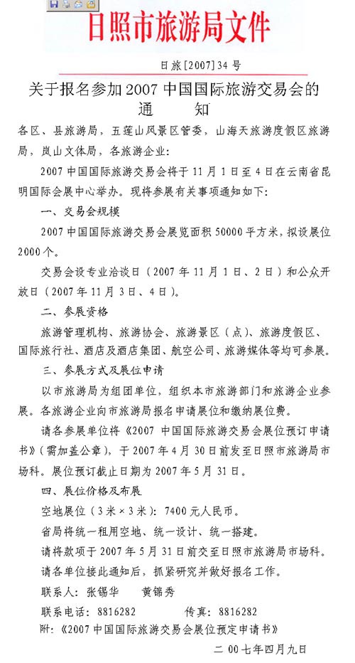 公告 关于报名参加2007中国国际旅游交易会的通知(2007年04月10日)