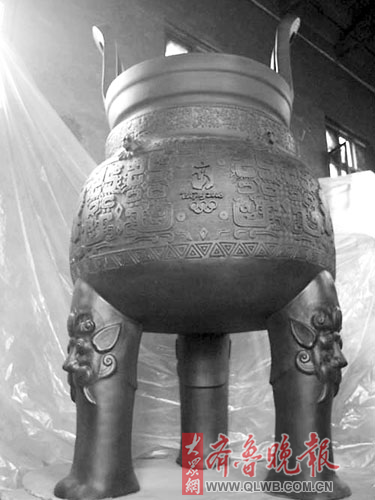 日前,日照民间黑陶艺术家苏兆启制作的黑陶奥运宝鼎成功出炉。该鼎以商鼎为原形设计制作,高2.66米,直径1.50米,壁厚约两厘米,重约600公斤,是目前为止世界上最大的黑陶鼎。苏兆启准备将这个鼎献给北京奥组委。