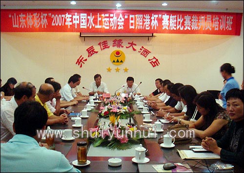 8月18日,“山东体彩杯”2007年中国水上运动会“日照港杯”赛艇比赛裁判员会议召开。 赛艇比赛作为水运会首场比赛、又是奥运会比赛项目,共有60名裁判员、717名运动员、315条艇参加,加领队、教练、工作人员和志愿者,与会人员近千人,是水运会中规模最大的项目,得到了社会各界的广泛关注。 比赛裁判工作是整个竞赛组织工作中的重要环节,关系着比赛的成败。裁判工作对赛艇比赛能否圆满成功,水运会能否开好头、起好步,都起着至关重要的作用。 此次赛艇比赛中,既有水运会比赛,又有全国锦标赛和大学生锦标赛,是国内规模最大的一次比赛,本次培训邀请资深国际裁判讲课,这对裁判工作提出了更高的要求,要求来自全国各地的裁判员严格按照赛艇竞赛规则和裁判工作守则开展裁判工作,做到公开、公平、公正、准确无误,为后续项目的比赛奠定基础。