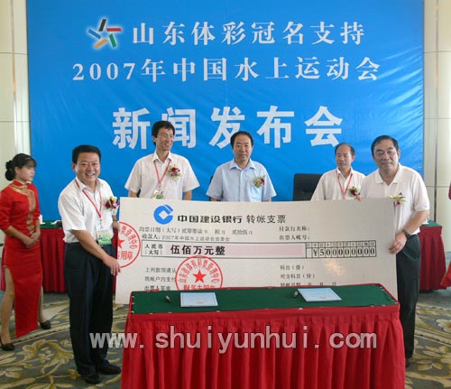8月25日,“山东体彩杯”2007年中国水上运动会总冠名单位新闻发布会举行。水运会组委会副主任兼秘书长、日照市副市长解世增,国家体育总局水上运动管理中心奥运保障部主任刘建勇、山东省体育彩票管理中心主任蒋强,水运会组委会副秘书长兼资源开发部部长、日照市体育局局长赵文胜出席会议。各新闻媒体和有关方面代表应邀参加发布会。发布会由日照市体育局副局长丁明春主持。