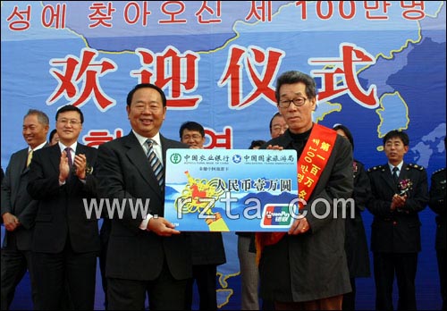 在庆祝仪式上,省旅游局局长于冲向林庆镐颁发“第一百万名韩国入境游客纪念牌”和一张价值一万元的金穗中国旅游卡。日照市市长杨军将一把象征欢迎与友好的“金钥匙”赠送给林庆镐。51岁的林庆镐激动地说:“这是我第一次来到日照,我幸运地成为第100万名韩国入境游客,我衷心地希望和山东省以及日照市人民分享我的快乐,我会在中韩友好交流以及山东旅游发展中做出自己的贡献!”