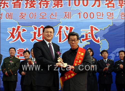 据了解,2005年年接待韩国游客50万人到2007年的100万人,仅用2年的时间,韩国年来鲁游客翻了一番,山东业已成为众多韩国客人出境旅游的首选目的地。山东省第100万名韩国游客林庆镐是由日照碧波国际旅行社接待,林庆镐旅游团一行50多人。
