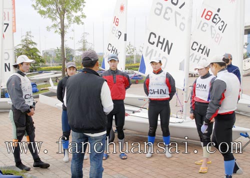 5月13日,中国帆船队(女子激光雷迪尔组)队员们在主教练刘小马带领下来到日照世帆赛基地进行赛前训练。这次训练主要是为了备战2008年奥运会,并为5月18日在日照举行的全国帆船竞标赛做热身准备。