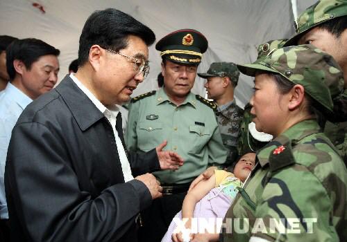 5月16日下午,中共中央总书记、国家主席、中央军委主席胡锦涛在受地震灾害严重的四川省绵阳市北川县擂鼓镇胜利村看望受灾群众。 新华社记者鞠鹏摄