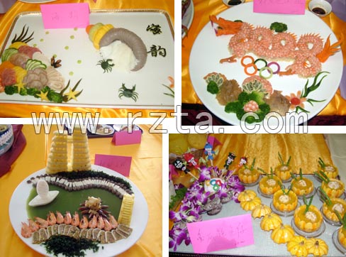 展厅里人头攒动、好不热闹。“祥龙迎奥运”、“扬帆日照”、“海韵”、“海上争艳”等这些别出心裁的菜名,以及福娃的设计, 五环标志等 ,充分体现了厨师们的独特创意和精湛技艺,让现场宾客大开眼界,赞不绝口,纷纷掏出相机、手机频频拍照。