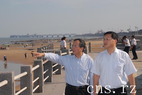 灯塔广场游人如织,林建华杨军一行漫步在灯塔广场的木栈道上,尽享海风带来的凉爽。在世帆赛基地,林建华详细了解了这里的规划建设背景及赛事举办情况,他还仔细询问了“中国环球航海第一人”翟墨驾驶的“日照号”帆船的航行情况;在水上运动广场,喷泉随着音乐时高时低舞动,经阳光的照耀,在空中出现一道道彩虹。随后又来到了万平口生态公园。优美的自然环境给林建华留下了深深的印象,对日照市加强环境保护和海岸带的规划建设、旅游开发取得的成果给予高度评价。他认为,日照市坚持高起点规划、高标准建设、高效能管理,很好地体现了以人为本、人与自然和谐共处的理念,实现了生态环境与经济发展的良好互动。