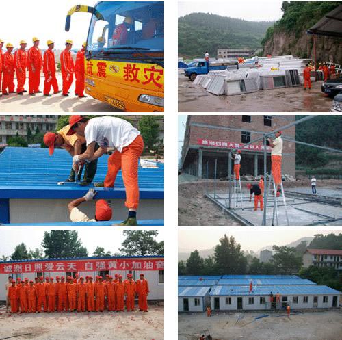 黄甸小学的建设安装任务完成后,根据我市前线援建指挥部的统一安排,我们的施工队伍又同时接到了学校、敬老院和灾民安置房等6处施工任务:三元义校54间校舍、黄甸镇政府广场149间灾民集中安置房、麻秧小学10间校舍、麻秧中学17间校舍、黄甸敬老院10间养老房、静光小学20间校舍。