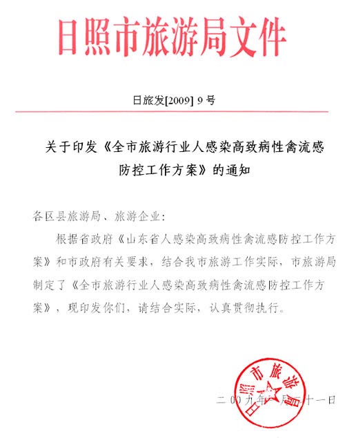 ↓点击下载:日照市旅游行业人感染高致病性禽流感防控工作方案↓
