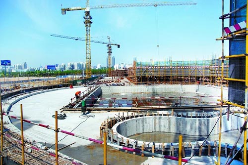 备受市民关注的日照游泳馆建设工程目前正按计划扎实向前推进。在四个施工区中,戏水馆区施工进展最快,二层底板支模、钢筋绑扎等工序已完成;训练馆区一层底板浇注完成,正在进行二层底板模板支护;跳水馆区地下室底板施工已完成,地下室剪力墙施工、馆内跳板跳台等设施的基础施工已相继展开;游泳馆区地下室底板施工基本完成,地下室剪力墙钢筋绑扎已开始。整个场馆土建主体工程计划于6月份完成。该项目是目前我市单项工程投资规模最大的一项建设项目,也是2010年第二届中国水上运动会重点建设项目,投资总额为3亿元。该工程的建设,将进一步丰富我市“水上运动之都”内涵,彰显城市魅力,提升城市知名度和美誉度。图为已初具雏形的日照游泳馆戏水馆区。