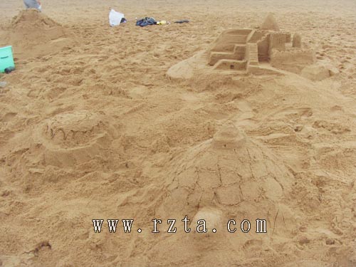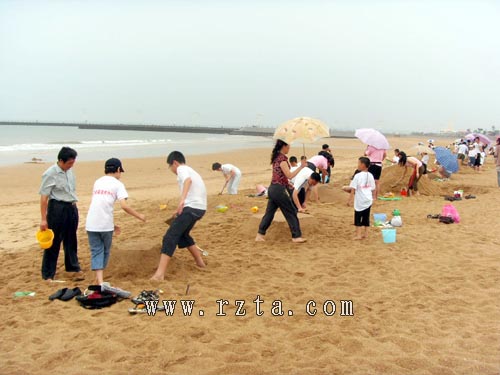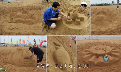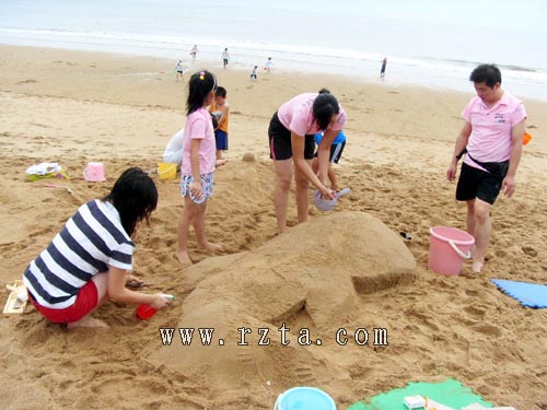 比赛刚开始,天空便下起了蒙蒙细雨,可这丝毫没有影响参赛选手的心情。由于摆脱了连日来的高温桑拿天气,此刻的沙滩上,海风习习,因此各组参赛家庭也都干得特别起劲儿。每个参赛家庭在自己的区域内有条不紊的塑造者各自的作品,有的家庭甚至全家总动员。别看人多,却分工明确,有的堆沙、有的运水、有的打伞、有的雕刻、有的指挥,全家上下,其乐融融。
