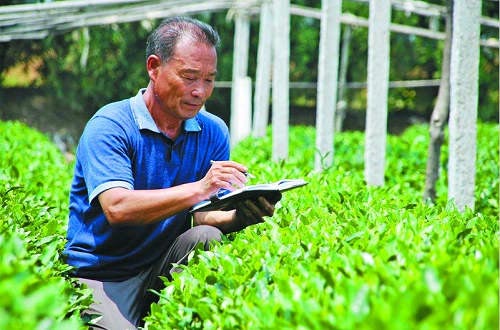 在日照茶界,徐经表无人不晓。就连农业部的茶树专家都专程来日照拜访他。如此蜚声“茶坛”,不单单因为他是个“老茶人”,更因为他对茶树的痴情、为日照茶业所做的贡献。 7月15日,在五莲县叩官镇的茶园里,记者见到了57岁的“土专家”徐经表。他正在给村民讲解茶园管理方法。村民对记者说:“老徐可是我们这一带的名人,种茶树、管茶园,谁都不如他明白,我们都叫他‘财神爷’。”可是这位‘财神爷’虽然有这么好的技术,却放着“炒茶”发财的事不做,专门租地研究起茶树来。如今,他租种20多亩地,培育着20多个茶树新品种。 1966年,正赶上南茶北引,当地被列为试点,村里就让“喝墨水多”的徐经表参加了这个项目。从那时起,他与茶树结下了不解之缘。1974年,他参加完省里组织的一次茶叶培训后,回家搞起了茶树种植对比试验。他发现,同样条件下,不同品种的茶树,品质、产量差距很大。这让他认识到良种在农业生产中的重要作用。于是,他萌发出为老百姓培育优良茶树的想法。为开阔知识面,他还多次自费外出与全国各地的茶树专家探讨育种技术。由于自费搞科研,徐经表的生活过得十分清苦。不仅如此,一个良种的培育得经过五六年的时间,所以还要耐得住寂寞。 经过这些年的不懈努力,在1995年第二届农业博览会上,他培育的“莲山翠芽”在全国茶叶评比中获得金奖;2006年,在“中茶杯”全国名优茶评比中,他培育的“茗博兰香”获得一等奖。 “做茶,三分在加工,七分在种植。要想提高我们北方茶叶的品质,就得为茶农们培育出优良的‘种子选手’。这样,日照绿茶才能卖上更高的价格,农民致富才不是一句空话。”说起茶树育种事业,老徐踌躇满志。 图为徐经表每天为茶树书写“成长日记”。(李青 摄影报道)