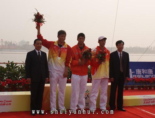 上午九点十五分,男子单人划艇决赛开赛,江西选手、两届奥运冠军以3项小组第一的成绩晋级决赛的杨文军不负众望以1分56秒131的成绩夺得本次比赛的金牌。来自广州队的李强和福建队的黄少坤分别以1分57秒389和1分57秒666的成绩摘得本次比赛的银牌和铜牌。