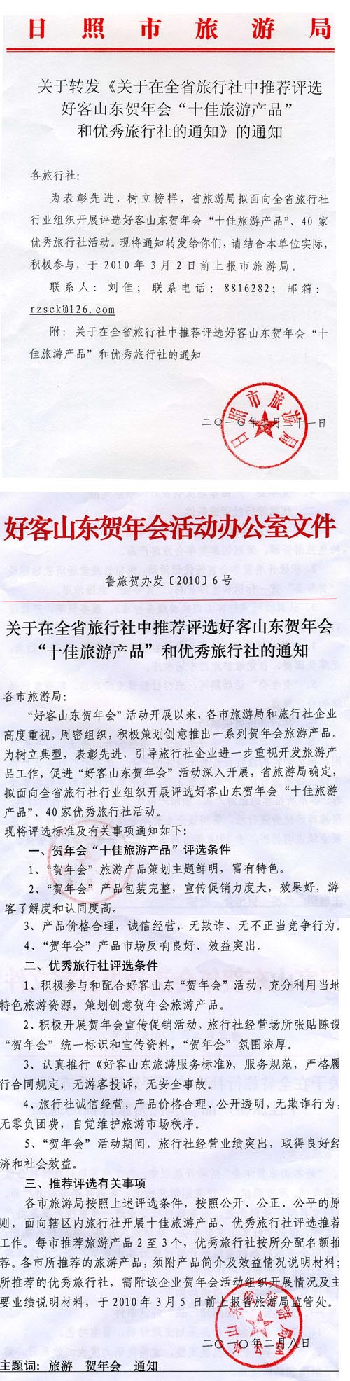 公告 关于转发《关于在全省旅行社中推荐评选好客山东贺年会“十佳旅游产品”和优秀旅行社的通知》的通知(2010年02月22日)