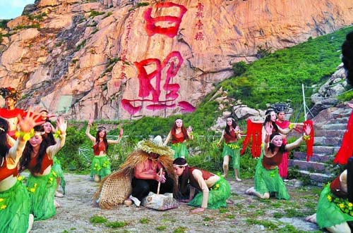 当日,河山之巅薄雾轻绕,当远处海面上第一缕曙光升起时,汉字摩崖巨书“日照”越显壮丽。观景台上,8名远古装扮的舞者开始翩翩起舞,一位老者在舞者环绕下转动着手中的采火棒,2010年中国水上运动会圣火开始以最古老的钻木取火方式采集。