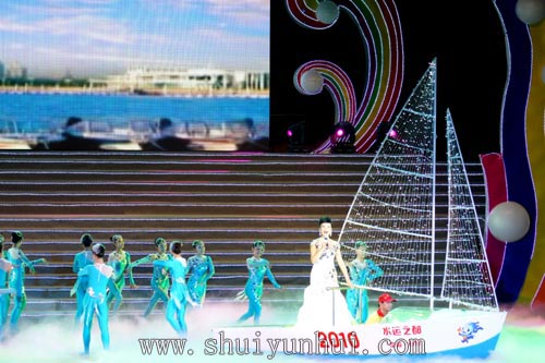 9月8日晚,2010年中国水上运动会闭幕式大型文艺演出在日照会展中心隆重举行。本次晚会以《水运之恋》为主题,从运动员的视角,分五个篇章描绘了日照这座“日出初光先照”的美丽城市留给他们的深刻印记,并用寄往不同城市、不同人物的明信片,串接起一份份如阳光般温暖的感动、如大海般蔚蓝的眷恋,表达着对这座充满朝气的城市的未来最隽永、最灿烂的希冀和祝福。