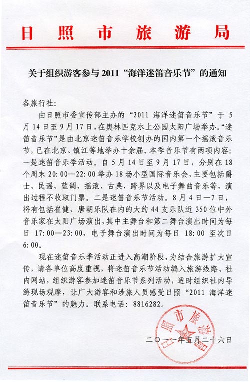 公告 关于组织游客参与2011“海洋迷笛音乐节”的通知(2011年05月27日)