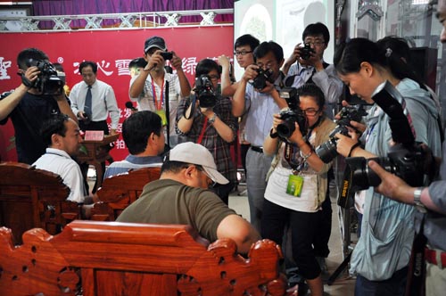 下午三点,在济南茶叶批发市场聚茗阁,圣谷山茶场负责人以图文的形式全面介绍了圣谷山有机茶园从2007年开始栽培到今年4月26日采摘、炒制、筛选的过程。拍卖师一声槌响,来自日照的圣谷山“冰心雪”有机绿茶开始竞拍。拍卖师报出这500克日照绿茶拍卖的底价为5万元。随着拍卖师一次次槌起槌落,“52000元!”、“58000元!”“6万元!”……竞拍者频频举拍加价。最终,一位竞拍者喊出了19.8万元!”经过短暂肃静,拍卖师举捶落定,全场轰动。