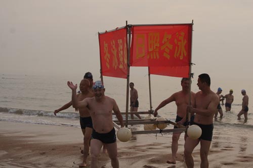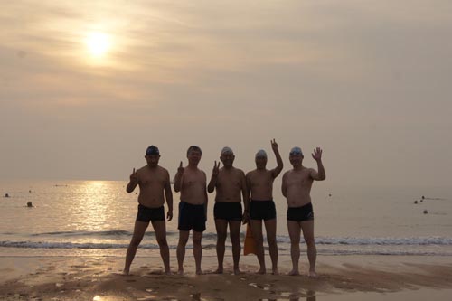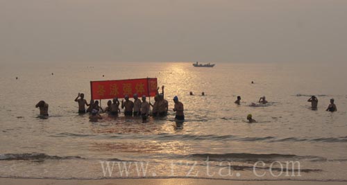 大海扬波旭日升,冬泳健儿迎国庆。9月25日六点,在金秋送爽、艳阳普照的早晨,日照市冬泳协会的全体会员和部分游泳爱好者齐聚在蓝天碧海金沙滩上,用游泳健身的特殊形式,庆祝中华人民共和国建国六十二岁生日。 同时还有数名冬泳协会的骑行爱好者,将在大海边启程,骑自行车去北京,到天安门广场参加国庆观礼活动。百人游泳庆国庆,众人骑车游北京。日照市冬泳协会会长朱云泉将8面袖珍国旗送给骑行队员,委托他们带到北京,插到天安门城楼上去,借以表达日照人民对祖国母亲的美好祝福。