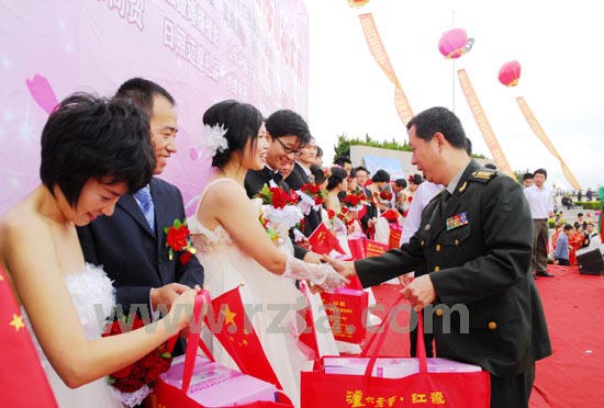 日照市人大常委副主席梁云爱出席婚礼庆典仪式活动并为新人证婚。市纪委党务副书记、监察局局长高月康,日照军分区参谋长郇敏、团市委书记袁利强市旅游局副局长禚磊和市文明办、市直机关工委等部门单位的分管领导参加了此次活动。苏浙皖豫的游客和日照市民等2万余人共同见证了隆重热烈的西式婚典。本次别开生面、时尚浪漫的集体婚礼,为假日的港城增添了一道喜庆的风景线。