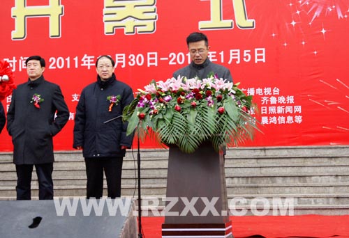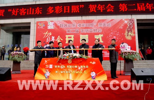 日照市旅游局副局长禚磊为开幕仪式致辞,本次年货交易会是“好客山东 多彩日照”贺年会的一项重要活动,为认真贯彻落实省委省政府关于“好客山东”贺年会文化旅游品牌的推广,日照市委市政府,日照市旅游局及相关部门和各优秀企业积极配合促进发展,整合各重大节事活动,使年节持续时间更长、年味更浓、消费更旺,使文化与旅游融合发展,对于传承节日文化、促进文化消费、转变经济发展方式、加快建设滨海文化名城具有重要意义。继第一届好客山东贺年会年货交易会的成功举办,“好客山东 多彩日照”贺年会第二届年货交易会已打响知名度,氛围更加热烈,规模更加宏大,为广大市民带来一次丰厚的节日盛宴。