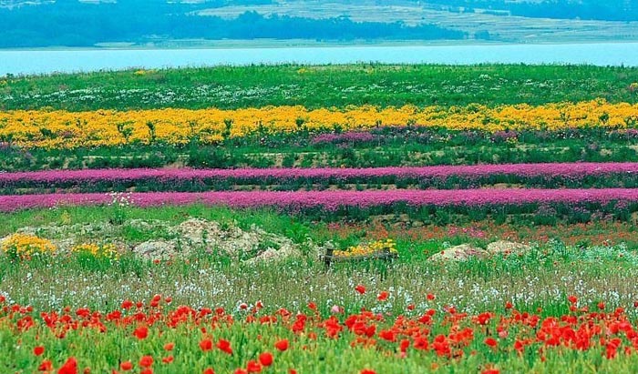 初夏时节,景区的花开的正是绚烂,大片大片的花团锦簇,清风吹过如涌动的花海。景区游人如织,拍摄婚纱照的准新人更是络绎不绝。游客们纷纷沉醉在这“赤橙黄绿青蓝紫”拼接的画面里,贪婪地呼吸着清新的氤氲。远远望去,大片大片的画彩渲染着湛蓝如洗的天空,单纯中充满着迷幻。云淡风轻间,闭上眼,安静地听那花开的声音,听风的呓语,听泉水叮咚,听风车转动,在那一片姹紫嫣红间,感受生命中涌动的活力与际遇。