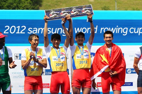 余成刚(左一)、黄喆、张国林、王铁鑫在领奖台上。图为市体育局提供。 2012赛艇世界杯5月27日在瑞士卢塞恩落幕,我市运动员余成刚与队友密切配合,以较大优势为中国队夺得男子轻量级四人单桨比赛冠军,取得伦敦奥运会入场券,成为日照第一位获得奥运会参赛资格的运动员,实现了我市竞技体育继全运会、亚运会帆板夺冠之后的又一重大突破。