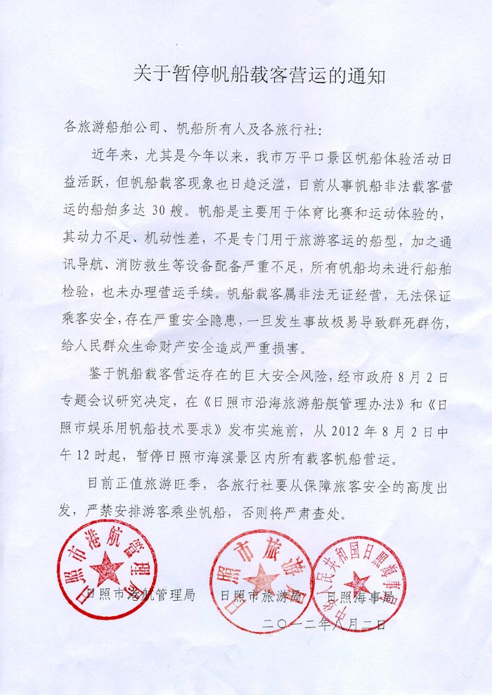 关于暂停帆船载客营运的通知(2012年08月02日)