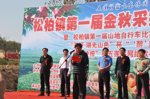 2012年10月2日,五莲县好客山东休闲汇—松柏镇金秋采摘节在百果谷生态旅游区举办。县委常委、副县长迟玉国,县人大副主任、总工会主席惠鑫,县政协副主席丁彩琴,县纪委副书记李海平,县人武部副部长周召安,县旅游和文体广电局局长单忠元,松柏镇党委书记王辉、镇长张华及市县旅行社代表,镇直负责人,来自北京、天津、河南、河北、江苏和省内各城市游客出席开幕式。 近年来,在县委、县政府的正确领导下,五莲县以“高端策划、山海联动、项目带动、转型升级”为宗旨,突出两山龙头、做精两区旅游,做活乡村游为工作重点,使旅游业得到大发展、大突破。2012年1-3季度全县共接待游客207.95万人次,实现旅游总收入17.8亿元,同比分别增长91%、280%。其中乡村游接待36.58万人/次,收入3075.54万元,分别占游客和直接收入总量的18%和33%。松柏镇凭借独特而又鲜活的乡村游特色赢得全省100个最美休闲乡镇荣誉称号,其中“山乡大年”、“好客人家”获全省精品线路。目前创建旅游强镇和省级旅游特色村工作基本完成,10月将迎接验收。松柏镇以丰富的资源、夯实的工作和精彩纷呈的节会活动成为乡村游的佼佼者和导航者。 五莲县松柏镇位于县城东10公里,紧靠风景秀丽的国家级森林公园九仙山风景区,全镇总面积70平方公里,辖31个行政村,约1.5万口人,森林覆盖率达63%。该镇发挥生态优势和果品资源优势,以健康休闲和观光采摘为目标,主动对接全县旅游总体规划,深入实施了“5+2”生态林果工程,重点规划建设了凤凰山、七连山、卡垛山等五大流域,突出建设完善了刘家南山“江北樱桃第一村”和窦家台子樱桃专业村两个示范村。先后投资760万元,新建停车场5个、开发采摘园35处、整修环山道路17公里、配套水利设施32处,打造凤凰山万亩生态林果观光园,2012年1一至三季度接待11.24万人次,收入1206.42万元。进一步打响樱桃品牌,提升了“樱桃名镇”的外向度。