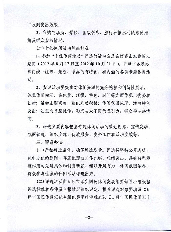 关于评选2012年日照市“好客山东休闲汇”优秀组织奖和十佳休闲活动的通知(2012年11月22日)