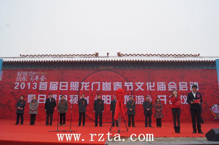 飞龙纳福辞旧岁,金蛇狂舞迎新春。2月6日早,2013年首届日照龙门崮春节文化庙会开幕暨日照电视台《阳光旅游》栏目开播仪式在龙门崮旅游度假区盛大启幕。日照市旅游局局长王立新、东港区政府副区长王海滨为龙门崮庙会金“龙”点睛;日照市旅游局副局长禚磊、日照广播电视台副总编李世成为日照电视台《阳光旅游》栏目开播揭幕;山东荣安集团董事长刘加楼以及东港区、三庄镇的相关领导出席了仪式并作了致辞。