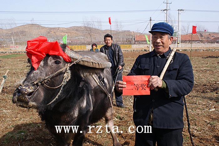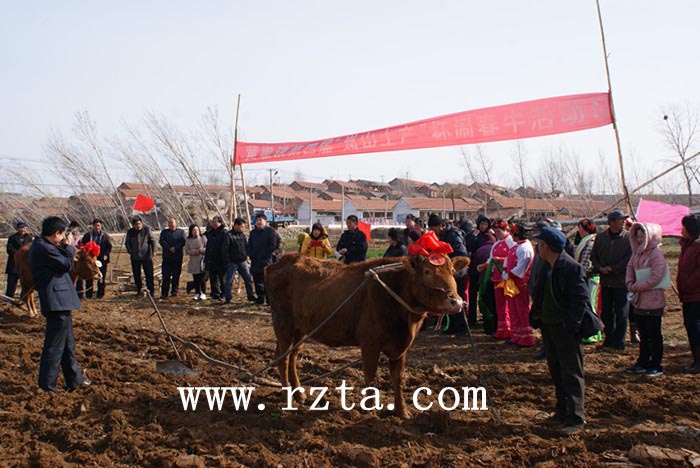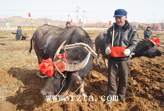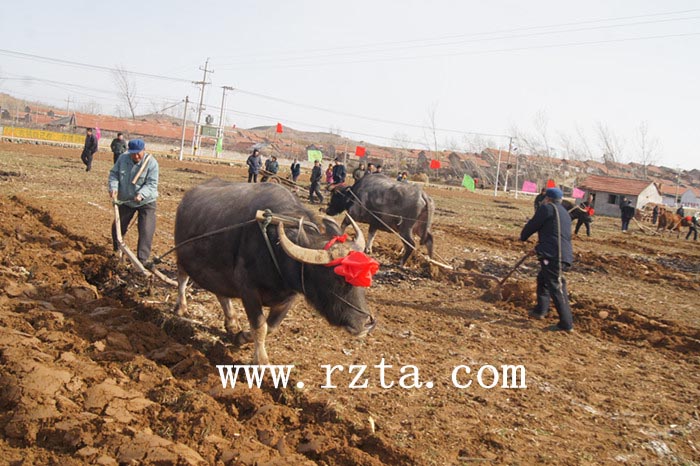 牛角拴红布,牛头戴上大红花,十组耕牛,统一佩戴号牌后一字排开。“预备…开始!”,赛令一发,牛儿们一个个庞大的身躯矫健地向前冲去,抖擞精神,仿佛憋了一冬的劲终于有地儿使了,“耕牛闹春”这就开始了。