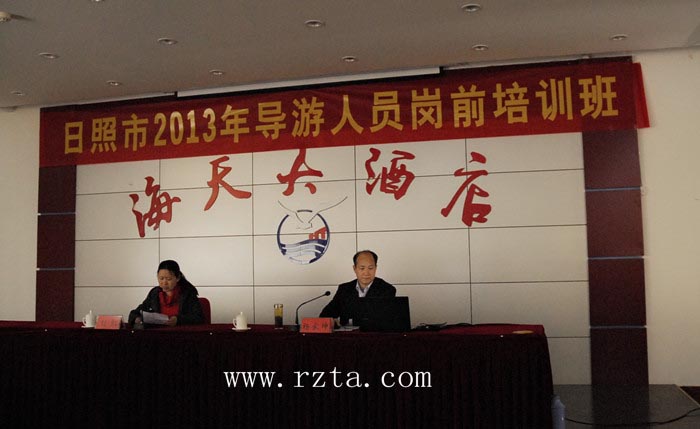 4月24日,日照市2013年导游员岗前培训班在海天大酒店举行开班典礼,日照市旅游局副局长杨家坤出席开班典礼并作重要讲话。 近300余名导游人员认真听取了培训课程。