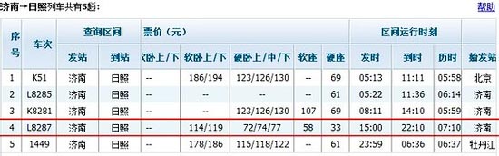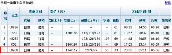 日照至济南列车达到每天5列 济南至日照列车共有5趟,硬座33元 从中国铁路客服网获悉,今年“五一”小长假期间,日照至济南增发两次列车,硬座票价仅为33元。 据悉,今年的“五一”小长假定为4月29日至5月1日。记者从中国铁路客服网查询获悉,4月28日至5月1日期间,日照至济南增发L8287和L8288两次列车,日照济南区间列车达到每天5列。 增发的两次列车中,L8287次列车是由济南发往日照,下午15时自济南发车,22时10分到达日照,历时7小时10分。L8288次列车是由日照发往济南,23时5分发车,次日早5时11分到达济南,历时6小时6分。 另外,考虑到季节气温,增加的两次列车均为非空调车。两车全程硬座票价仅33元,软座票价58元,硬卧票价分别为72元、74元、77元,软卧票价为114元和119元。票价分别是现有日照至济南列车票价的二分之一。