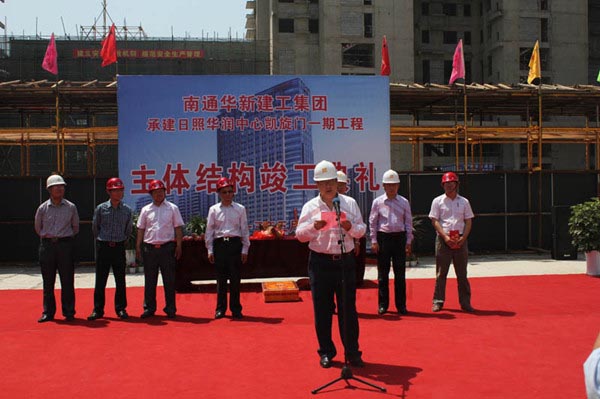 2013年5月13日上午,在轰鸣的礼炮声中,华润置地(日照)有限公司总经理、华润中心项目总经理、南通华新建工集团董事长等高层领导以及业主代表,共同启动了封顶仪式,见证了这一激动人心的时刻,伴随着最后一方混凝土的浇筑到位,由南通华新建工集团承建的华润中心•凯旋门一期10#、11#、12#、13#结构主体全部封顶。