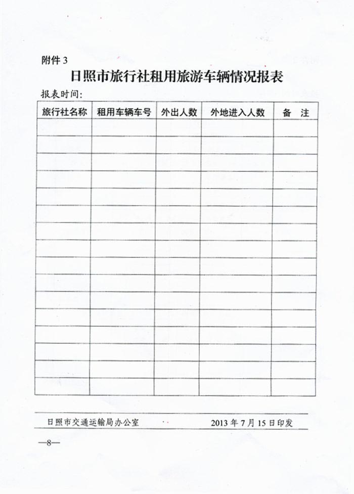 点击查看附件 1.日照市旅游团队用车确认书 2.日照市旅游客运车辆运输情况报表 3.日照市旅行社租用旅游车辆情况报表