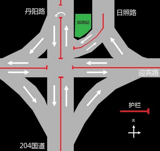 自丹阳路建成通车后,与迎宾路、G204国道和日照路的路口成为了市民议论的话题。这条被网友成为“最费脑力”的路口实际上是一个五岔口。23日,记者从相关部门了解到,此路口的设计通过了多个部门共同协商而完成,曾考虑过大转盘设计或将日照路东移,但均被否定。目前正考虑在日照路路段上,位于此路口北侧再开通一条路,以方便市民拐向丹阳路。 五岔口引争议 网友戏称“最费脑力”的路口 市民热议的这个路口,位于日东高速收费站的东侧,也是市民熟知的老酒厂的位置,是迎宾路、丹阳路、日照路、G204国道的交叉路口。其中,迎宾路为东西路,直接连接日东高速收费站,丹阳路(原西外环)、日照路为南北路,位于该路口的北侧,向北都通向G204国道。G204国道则位于该路口的南侧,直接通向岚山。 “以前这个路口还挺好走,当时的丹阳路,实际上是通过加油站汇到日照路,然后通向204国道。但是当时车少,其实怎么设计都没问题。现在好了,日照路实际上等于封上了,要往204国道走或者左拐,必须绕道丹阳路才行,而大部分人都不会走这条路。”一位市民告诉记者说。 “来日照旅游这两天,算是被这条路整糊涂了。订的宾馆是在日照路上,第一天就是从日照路往岚山走,走到头之后发现只有一条右拐的路。而且这条右拐的路上,还有车辆驶向我们的方向。右拐之后发现不能直接向前到达204国道,因为很多大车一直往北开。观察了很久之后,我们才无奈往北拐到丹阳路上,到远处掉头。”游客宋先生对记者说,往北拐到丹阳路属于无奈之举,后来发现原来只能这么走。 据了解,自从这个路口开通后,几乎所有的网友对路口的设计表示十分不满。令记者十分惊讶的是,在调查期间短短五分钟内,就有4辆汽车不知如何通行,停在日照路与丹阳路的交汇处。北侧的丹阳路掉头处,则由于掉头车辆较多,显得十分拥堵。 那么这个路口到底该如何通行呢?22日,记者通过实地考察和相关调查得到了答案。 从日照路直行、左拐、右拐都需绕行丹阳路 22日下午,为了了解此路段如何通行,记者驾车来到了此路口进行了调查。 记者看到,迎宾路、丹阳路、G204国道都有直接右拐的通道。通过右转通道,东侧的迎宾路可右转至日照路,西侧的迎宾路可右转至G204国道。G204国道和丹阳路可右转至迎宾路。除了日照路的通行,其他道路的通行都没有任何问题。 其中,争议最大的就是日照路通向其他道路的走法。记者驾车体验时看到,在经过日照路与兴海路路口时,就有一个提示牌,提示通向G204国道可右拐至丹阳路,记者右拐后发现通过丹阳路通向其他道路没有任何问题。而如果没有右拐并且通过了此路口,就需要注意了。 记者看到,在日照路南尽头,有两个岔路,其中左边的岔路为迎宾路的右拐路,一般不会有人走错。而右侧的岔路,实际上又被护栏分开了两条通道,这也是最容易走错的通道。其中,沿着右边的通道行驶,可以绕道丹阳路,然后在距离路口约五六十米的地方掉头,再向北行驶。而此岔路左边的通道,实际上是G204国道和迎宾路向日照路通行的通道,并非日照路通向G204国道的通道。 既然此路段如此“难走”,那当初为什么不设计成网友建议大转盘而偏偏设计成掉头通行呢?记者联系到道路的相关施工和设计部门了解了详情。 大转盘不可行曾设计将日照路东移 路口北侧或开新路 “在前些年,大转盘是很流行的。其实也有想过大转盘的设计,但是经过调查发现,如果车流量很大的话,大转盘更容易造成拥堵。迎宾路和日照路路口本身车流量就大,加上经常有大型货车经过,很容易造成拥堵,所以通过各个部门商定,认为在这里设置大转盘是不可行的。”日照市建委城建科一位工作人员告诉记者。另外,记者采访了一位交警部门的工作人员也表示,曾经考虑过设置大转盘的方案,但是最后被否决了。 “另外,当初有个方案,想把目前的日照路东移,彻底解决这一块交通问题,但是由于牵扯到旧城改造,很麻烦,就没有实施这个方案。目前来说,日照路东移也很困难,即使有规划,也要三五年之后了。”日照市建委城建科一位工作人员告诉记者。 对于此路段今后如何解决,记者了解到了部分详情。 “现在正在商讨一个方案,在日照路路段上,位于这个路口北侧的会开通一条路,叫友谊街,会将日照路与丹阳路连接起来。这样从日照路往南向204国道通行的市民,可以通过友谊街提前拐到丹阳路往南走。”城建科工作人员告诉记者,目前这条路正在进行设计。