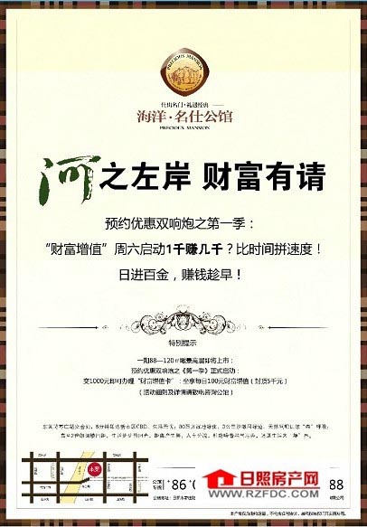 海洋·名士公馆——河之左岸,财富有请!预约优惠双响炮之第一季:“财富增值”周六启动1千赚几千?比时间拼速冻!日进白金,赚钱趁早! 特别提示:一期88-120㎡瞰景高层即将上市,预约优惠双响炮之《第一季》正式启动:交1000元即可办理:“财富增值卡”:坐享每日100元财富增值(封顶5千元)。活动细则及详情请致电咨询公馆。