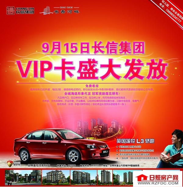 长信·书香河畔,9月15日VIP卡盛大发放! 长信·书香河畔,看房班车已开通,每日两班,请提前电话预约,即日起到长信·书香河畔看房,都将凭票据报销公交车票。 长信·书香河畔,冠军奖励莲花轿跑! 凡日照户口、在日照常年工作、在日照上学均可免费报名参加海选 无年龄,无性别限制,不设评委,不设嘉宾、以现场投票和网络投票为准,只要您有自信,有勇气! 报名地点:长信·书香河畔售楼处(报名者送长信俱乐部健身卡一张) 相关链接: 长信·书香河畔位于日照市昭阳路369号(与潍坊路交会处),西邻香店河,东邻高科园小学,环境优美,教育资源优越。由高层、小高层、多层、洋房和一栋6班幼儿园组成,项目东邻高科园的小学,西侧紧临香店河,70-92㎡中小户型,轻轻松松安个家。