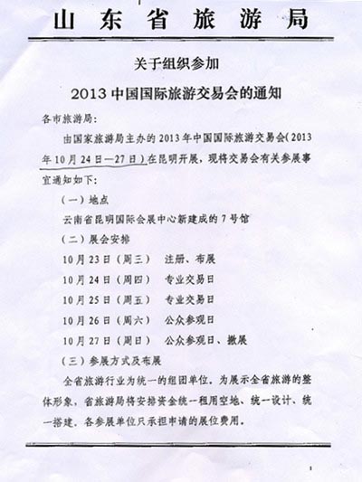 关于转发省旅游局《关于参加2013年中国国际旅游交易会的通知》(2013年09月23日)