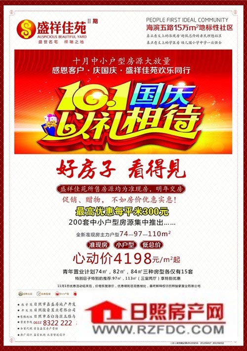 盛祥佳苑所售房源均为准现房,明年交房。促销、赠物,不如房价优惠实惠。最高优惠每平米300元!200套中小户型房源集中推出,全新准现房主力户型74-97-110㎡,心动价4198元/㎡起!