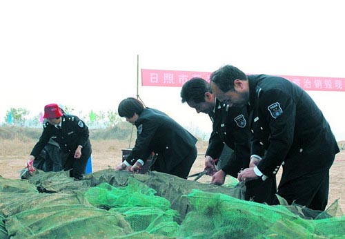 图片说明 执法人员正在销毁收缴的违规地笼网 10月23日,293件违规渔具在莒县陵阳镇官河口老桥东被集中销毁。当日下午,全市违规渔具清理整治现场会暨黄渤海区渔政局违规渔具清理整治督导汇报会在莒县召开。 据了解,渔业作为资源型产业,近年来,呈现逐步衰退的趋势,在一些地方出现了掠夺性的捕捞,违规渔具的网目尺寸越来越小,使用电捕鱼器等渔具违法、违规捕捞现象屡禁不止。 自今年8月起,我市开展了为期3个月的清理整顿违规渔具专项行动,加强渔业水域生态保护。各级渔业行政主管部门深入渔村、渔港、渔船、渔户调查摸排违规渔具的使用、存储情况。引导渔民渔户主动上缴、销毁违规渔具,对在规定期限内不能自行销毁到位的违规渔具,按法定程序没收后强制销毁。 按照《我国渔业法》有关规定,“禁止使用炸鱼、毒鱼、电鱼等破坏渔业资源的方法进行捕捞。禁止制造、销售、使用禁用的渔具。禁止使用小于最小网目尺寸的网具进行捕捞。” 今后,我市还将坚持专项检查与日常检查相结合,保持打击违规渔具的高压态势,推动渔具渔法的管理纳入常态化执法。加强违法案件惩处力度,涉嫌犯罪的,按有关规定移交司法机关依法追究刑事责任。 截止目前,全市共查获违规渔船17艘,拆解泡沫质筏式捕捞工具5艘,收缴地笼网400余条、电鱼设备72台套,拆除绝户网1600米,有效地维护了渔业生产秩序。